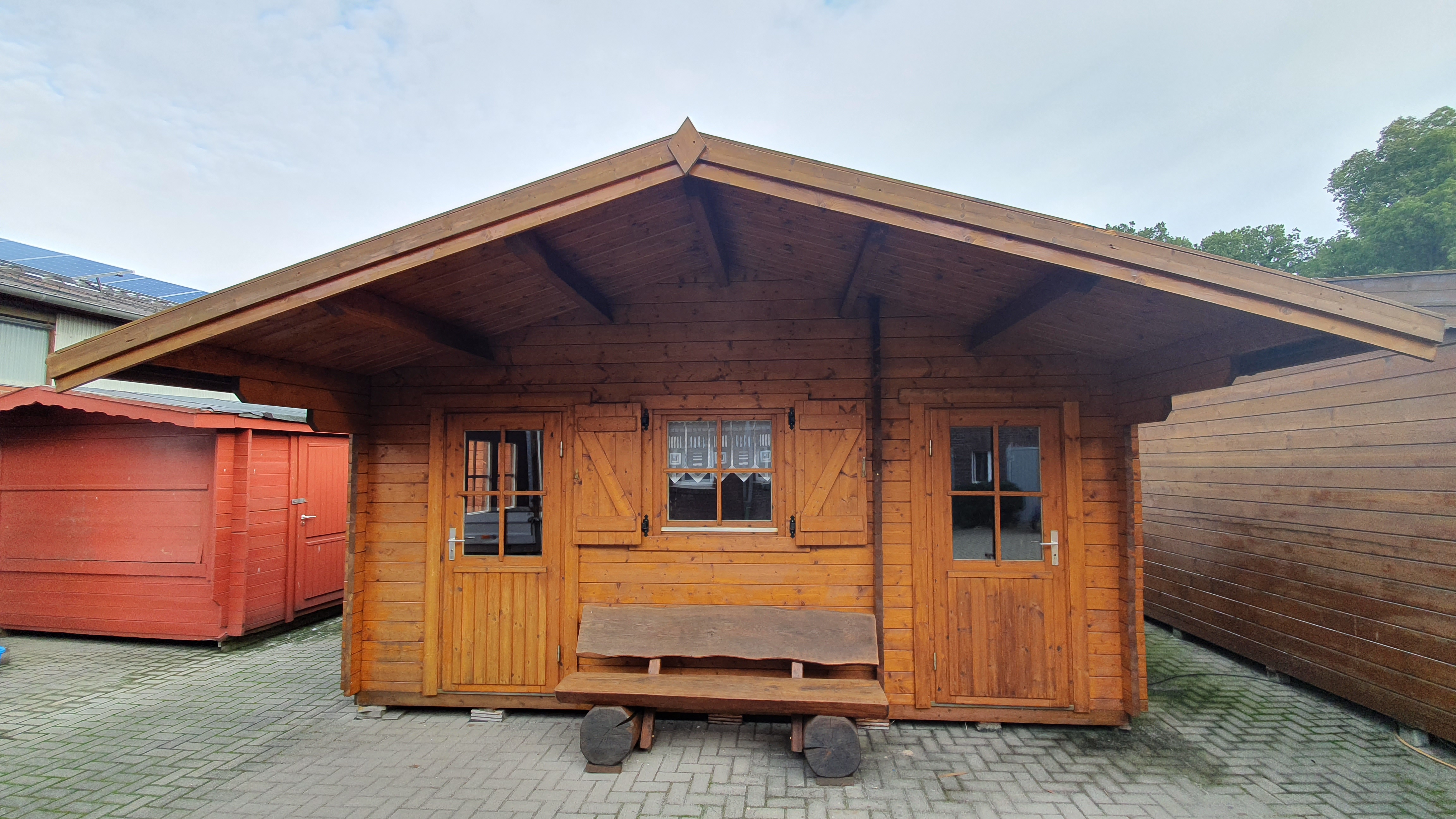 Massivholz Blockhaus Mit 2 Doppelfenstern und Blendläden Inkl. Anbau Wandstärke: 45 mm Abmessungen: 5,00 m x 3,50 m Holz: nordische Fichte